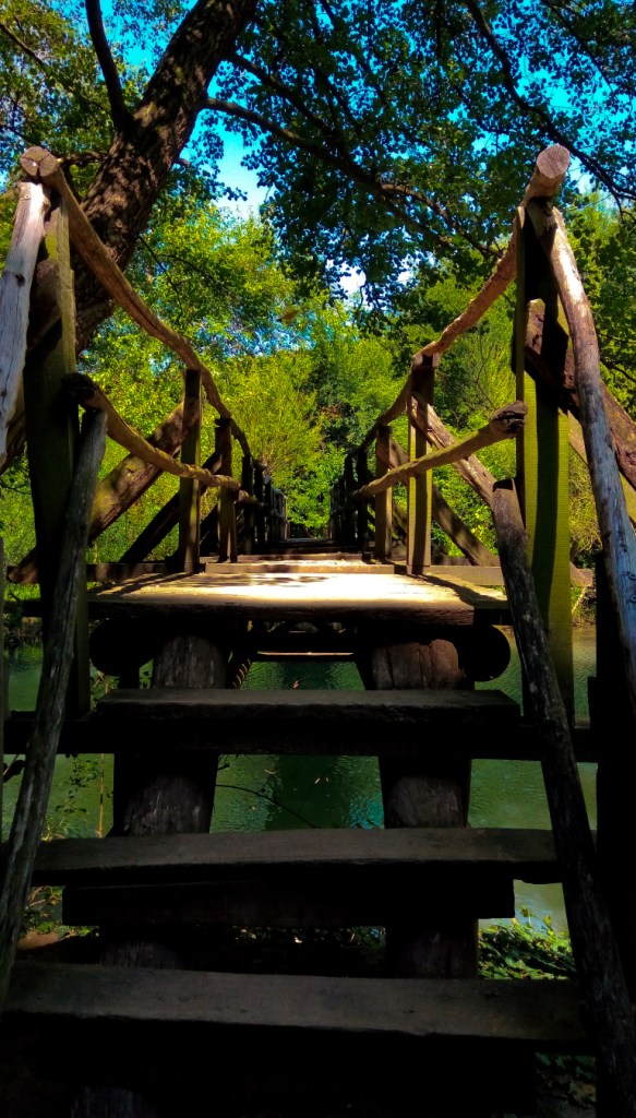 Веднага след арката вдясно пред Вас ще се разкрие изключителна гледка, има пътечка с дървен парапет, а малко по- надолу виещи се стълбички по стръмен склон, който на места е доста тесен. Внимавайте! Малко след спускането ще се озовете на голяма поляна и ще видите беседка и мостче. Много вероятно е да не ви направи впечатление, че на беседката има табела на къде да поемете за екопътеката и да се отправите директно към мостчето. Поемете на дясно на беседката. По пътя ще Ви придружават облаци от водни кончета, а заобикалящата природа действа като еликсир за душата. И така от мостче на мостче, реката ту от ляво, ту от дясно, стигаме до най- интересната част, а именно мостът изграден до скалата. Изживяването е неописуемо. Пастелните цветове на реката омайват с красотата си, птичките пеят своята песен, а слънцето гали лицето ти. Какво повече му трябва на човек?! Ако сте любители на барбекюто това е вашето място, има маси, пейки,а в самите скали има стълбички , които те отвеждат до панорамна тераса, на която също има маси и пейки. Да ти е кеф да седнеш и да се любуваш на всичко заобикалящо те. Ако продължите напред по табелите ще стигнете до равен терен, който не е маркиран и поддържан, така че ако не знаете пътя по- добре не продължавайте. Ние стигнахме до тук и се върнахме.